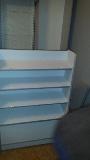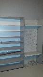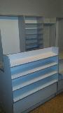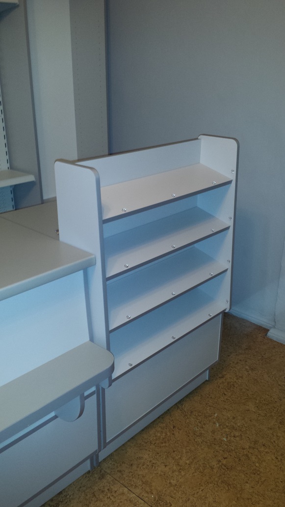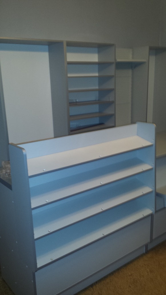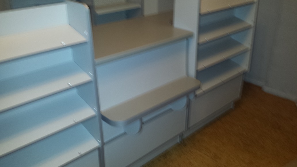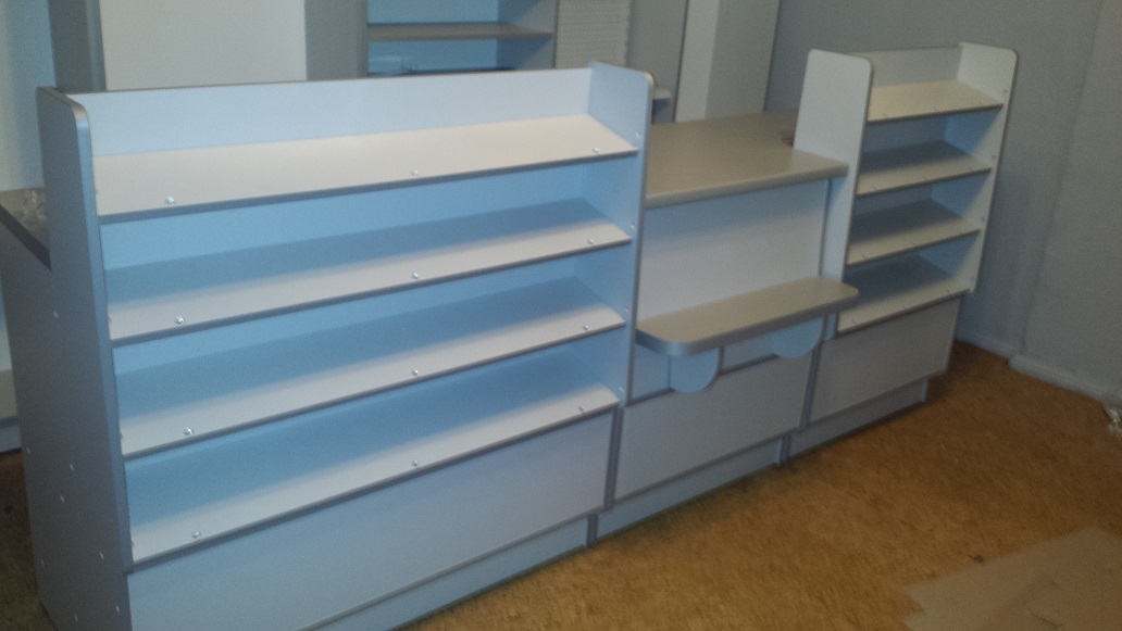 Mały sklepik spożywczy wykonany przy użyciu mebli firmy ALBO z ladami impulsowymi w/w firmy oraz ladą z półką klienta - całość w kolorze szarym.
