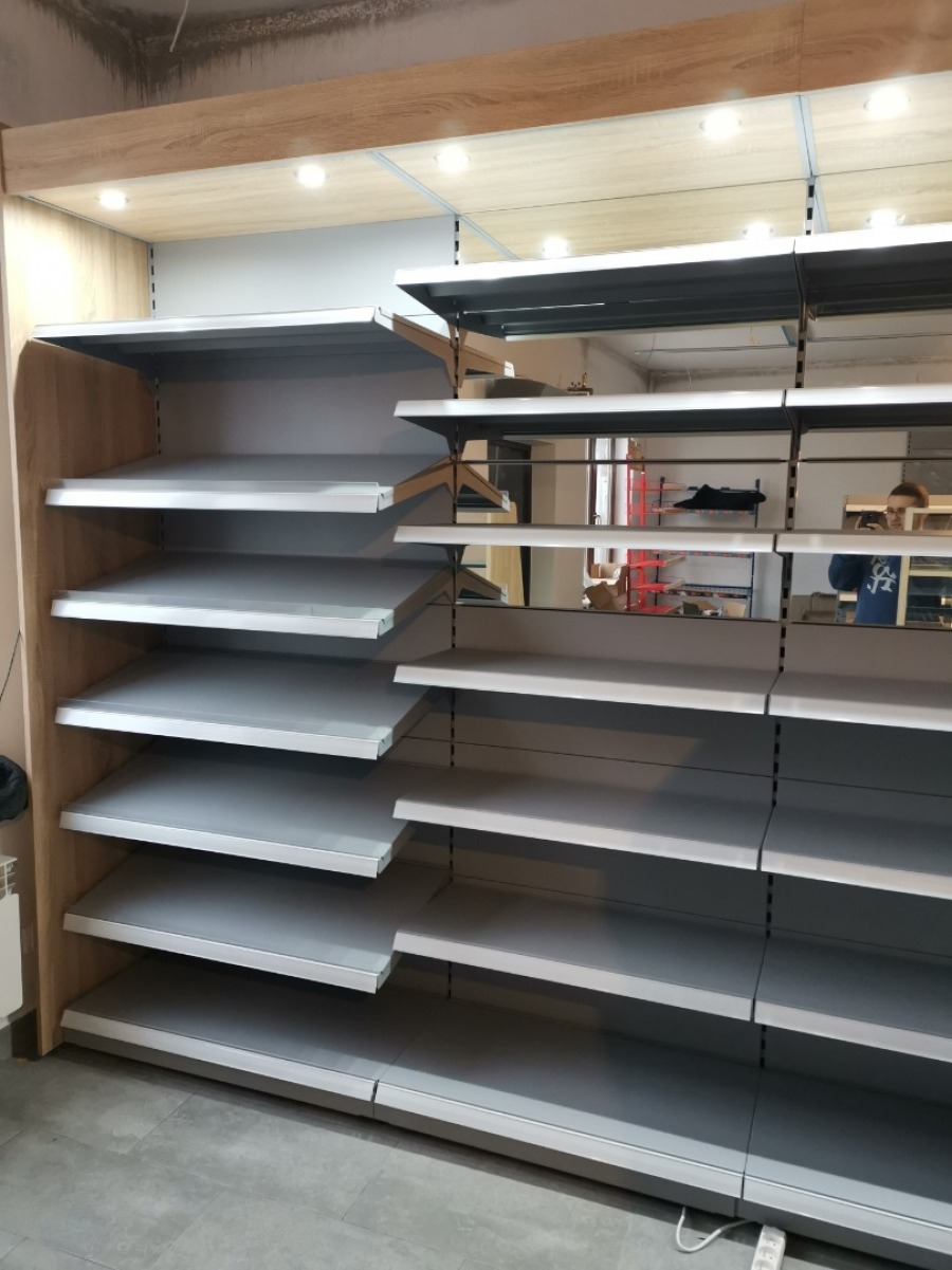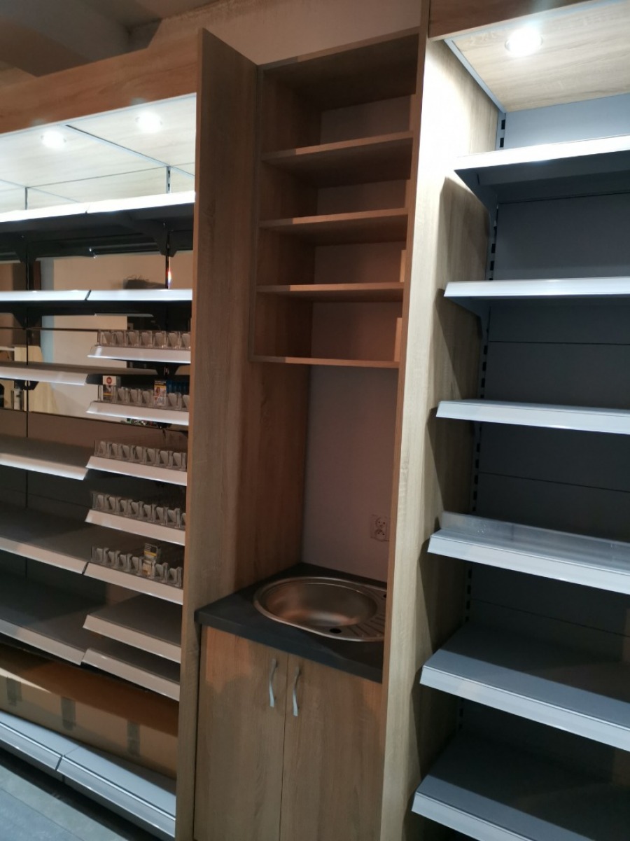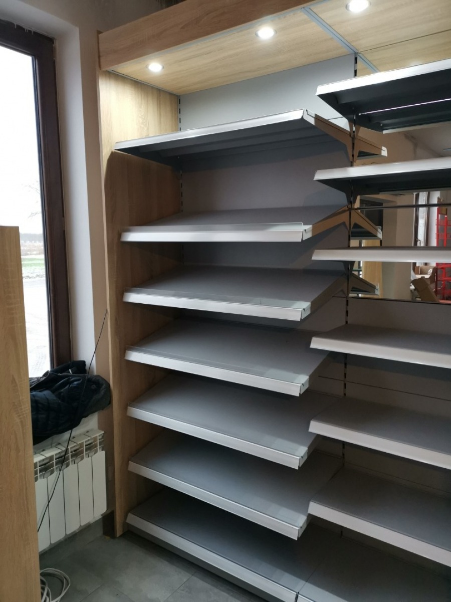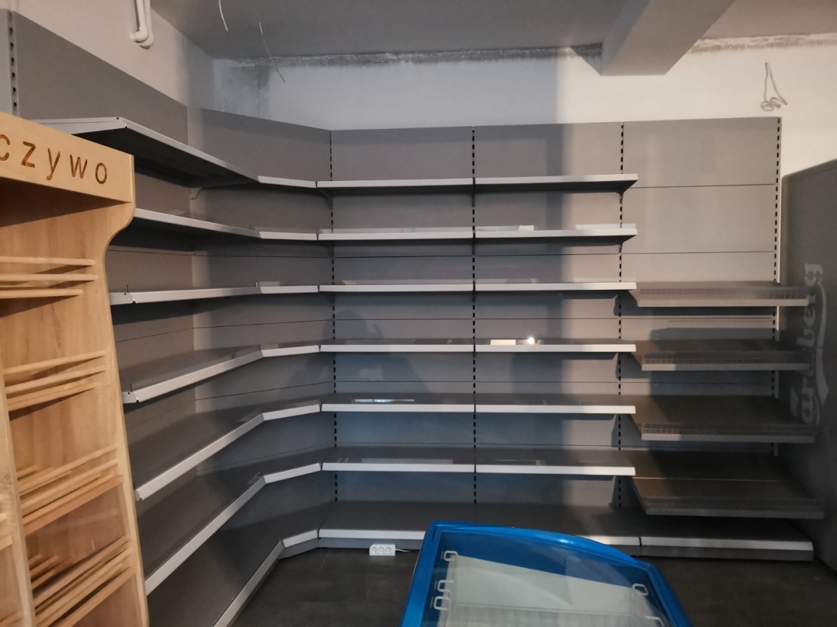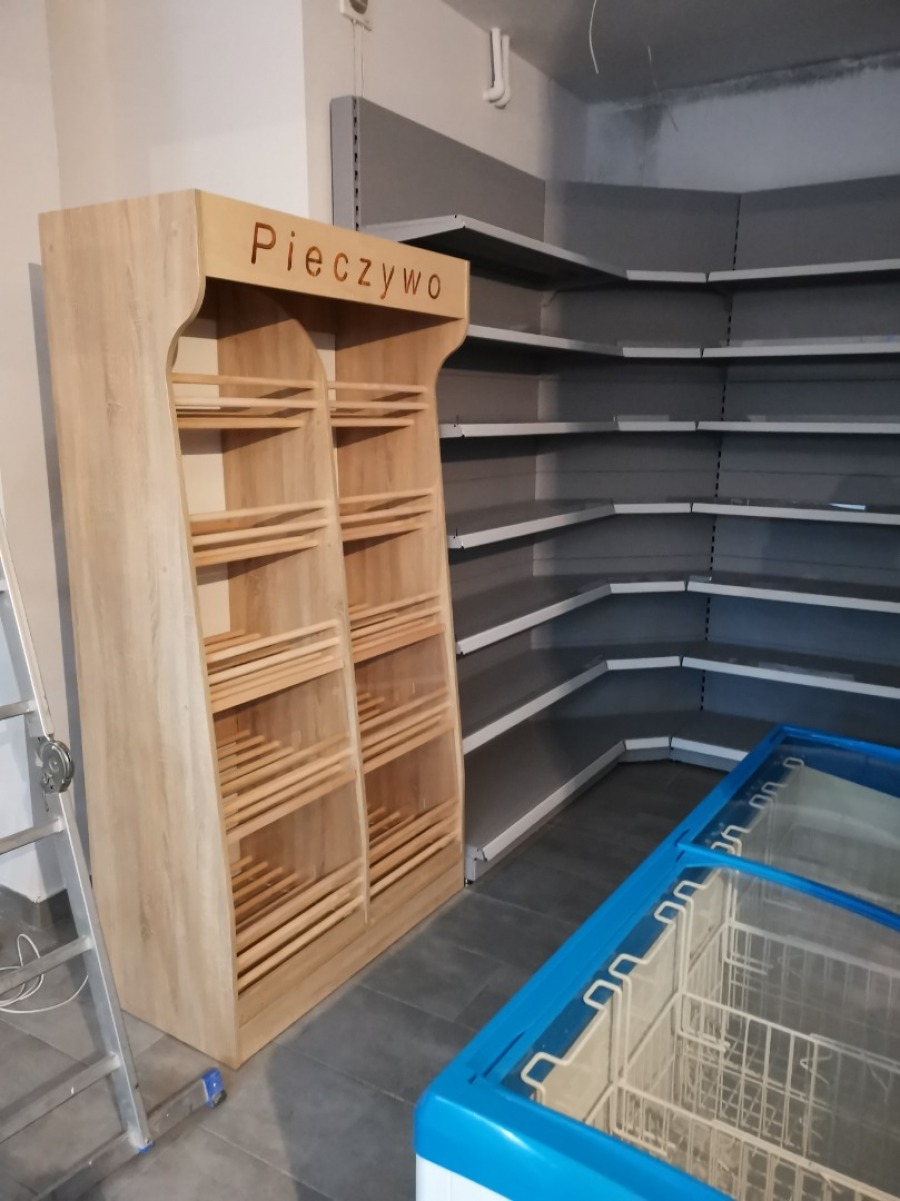 Niewielki sklep spożywczy umeblowany regałami metalowymi w kolorze szarym RAL-7040 z elemenetami z płyty w kolorze dąb sonoma. Regał alkoholowy jest wyposażony w lustra na plecach i podświetlenie Led od góry. Ponadto w regał alkoholowy jest wkomponowany regał na papierosy z popychaczami i przegrodami. Obok regału alkoholowego jest regał z pochylonymi półkami na ciastka luzem. Lady sprzedażowe są wykonane z płyty w kolorze dąb sonoma z szarym blatem. Obok lad stoją 2 oszklone gabloty, jedna na pączki i słodkie bułki, a druga na cukierki luzem.