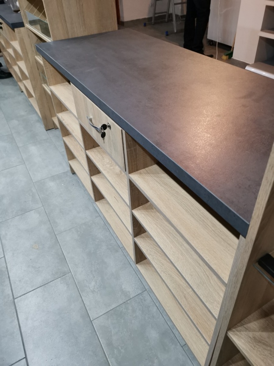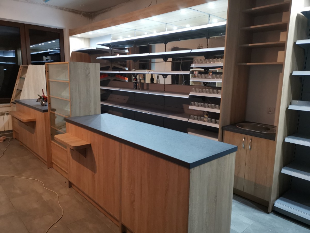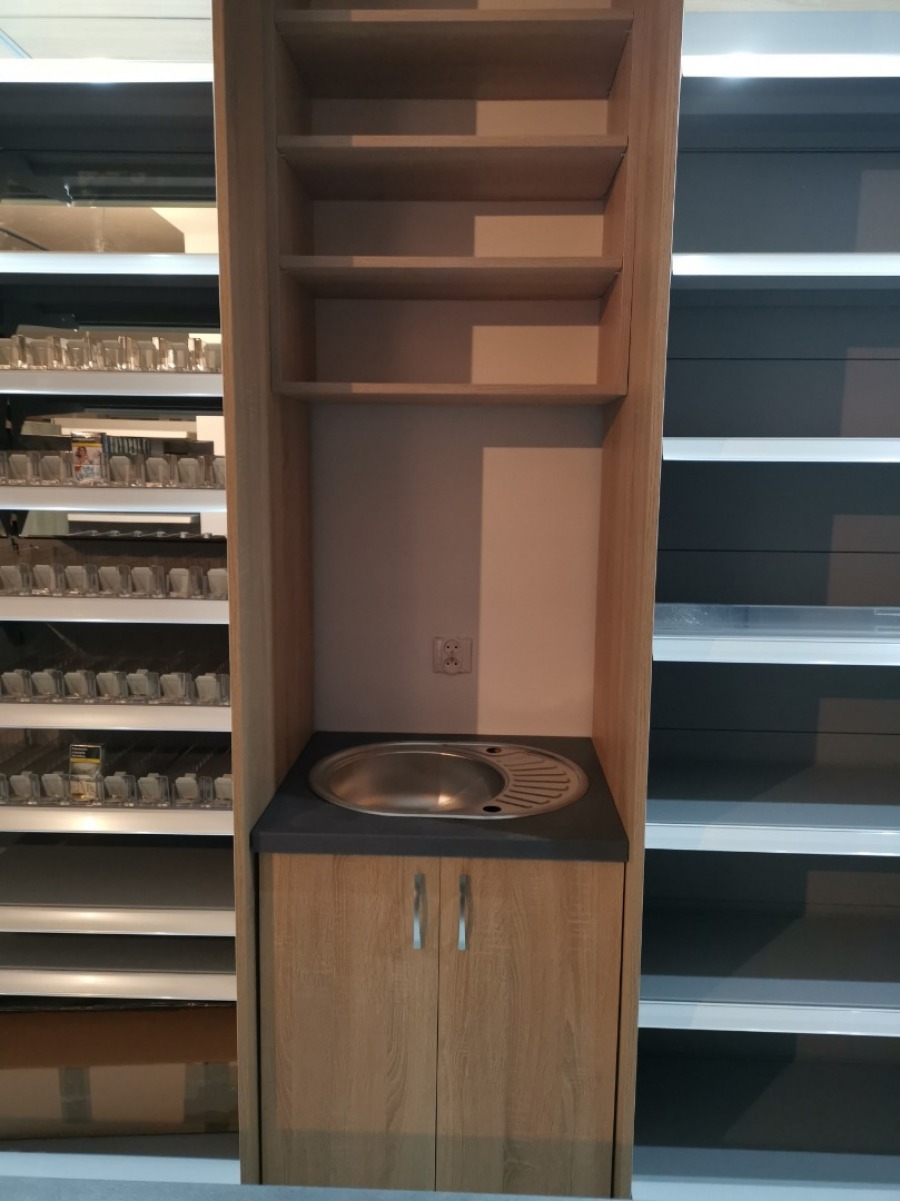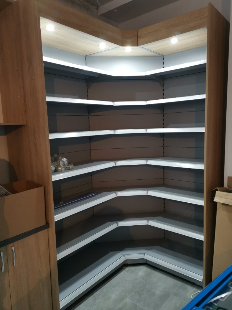 Niewielki sklep spożywczy umeblowany regałami metalowymi w kolorze szarym RAL-7040 z elemenetami z płyty w kolorze dąb sonoma. Regał alkoholowy jest wyposażony w lustra na plecach i podświetlenie Led od góry. Ponadto w regał alkoholowy jest wkomponowany regał na papierosy z popychaczami i przegrodami. Obok regału alkoholowego jest regał z pochylonymi półkami na ciastka luzem. Lady sprzedażowe są wykonane z płyty w kolorze dąb sonoma z szarym blatem. Obok lad stoją 2 oszklone gabloty, jedna na pączki i słodkie bułki, a druga na cukierki luzem.