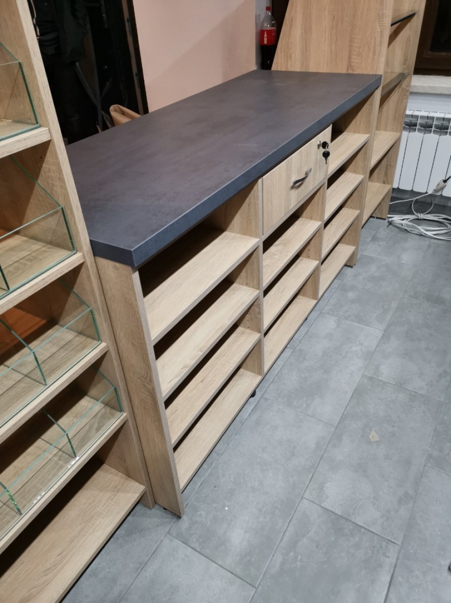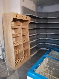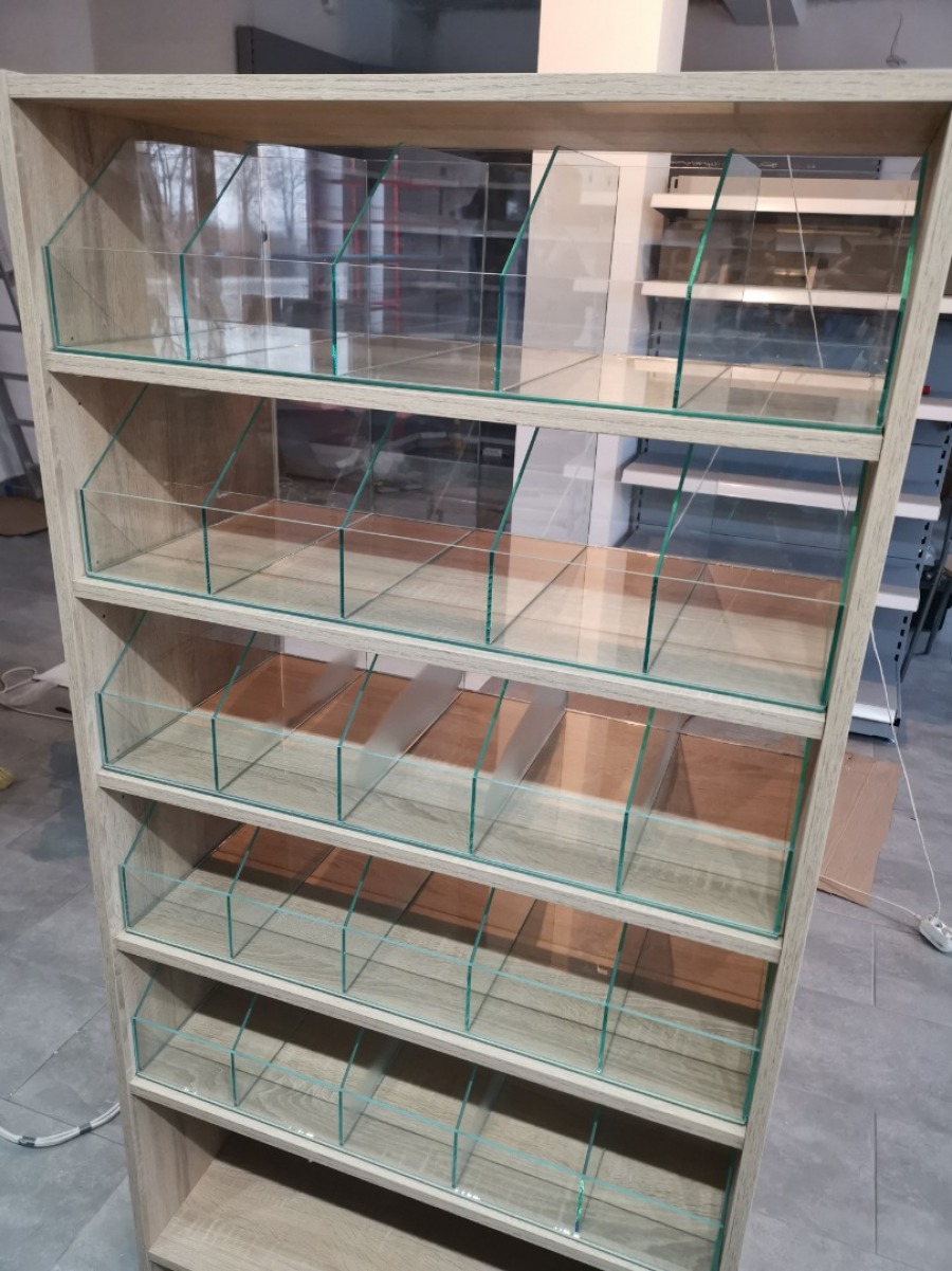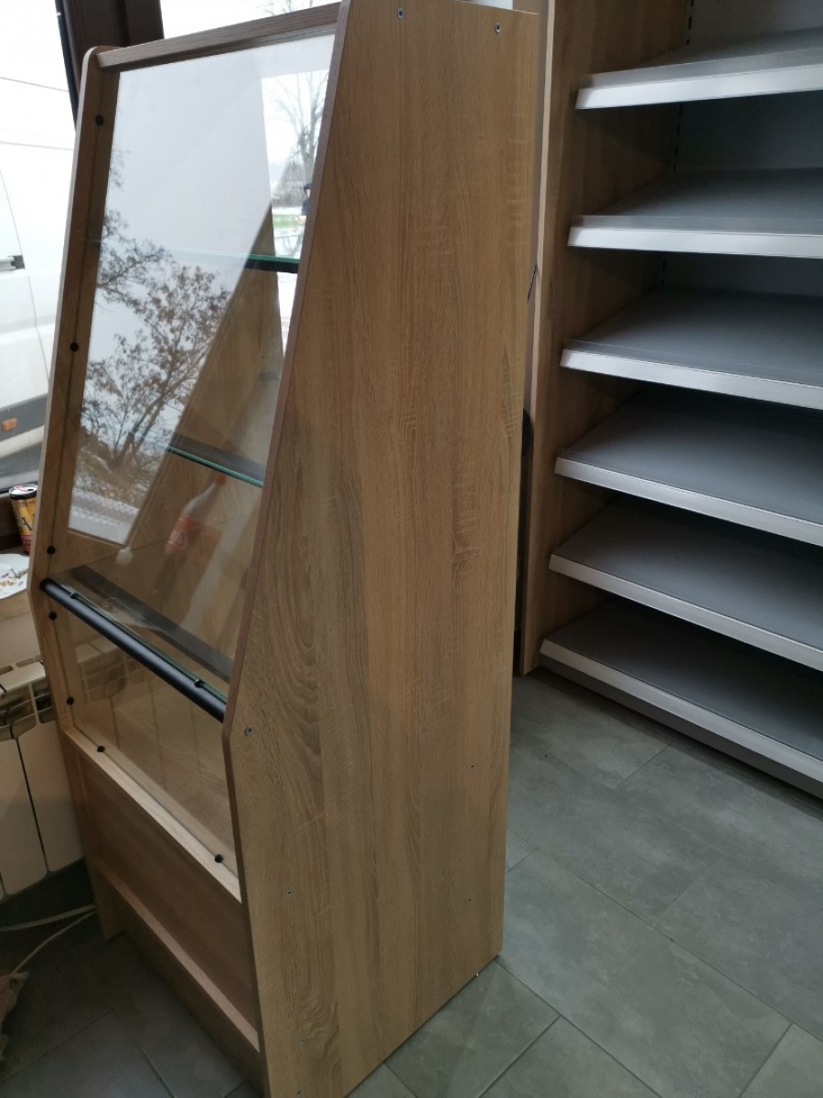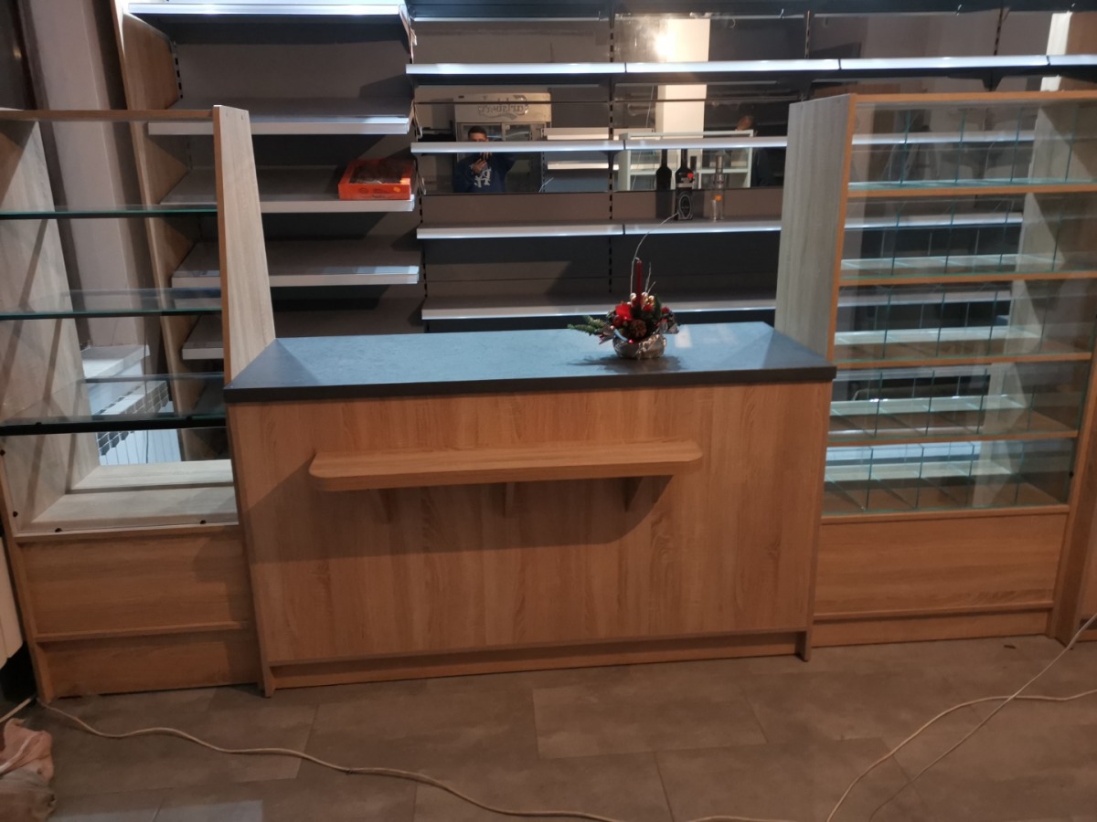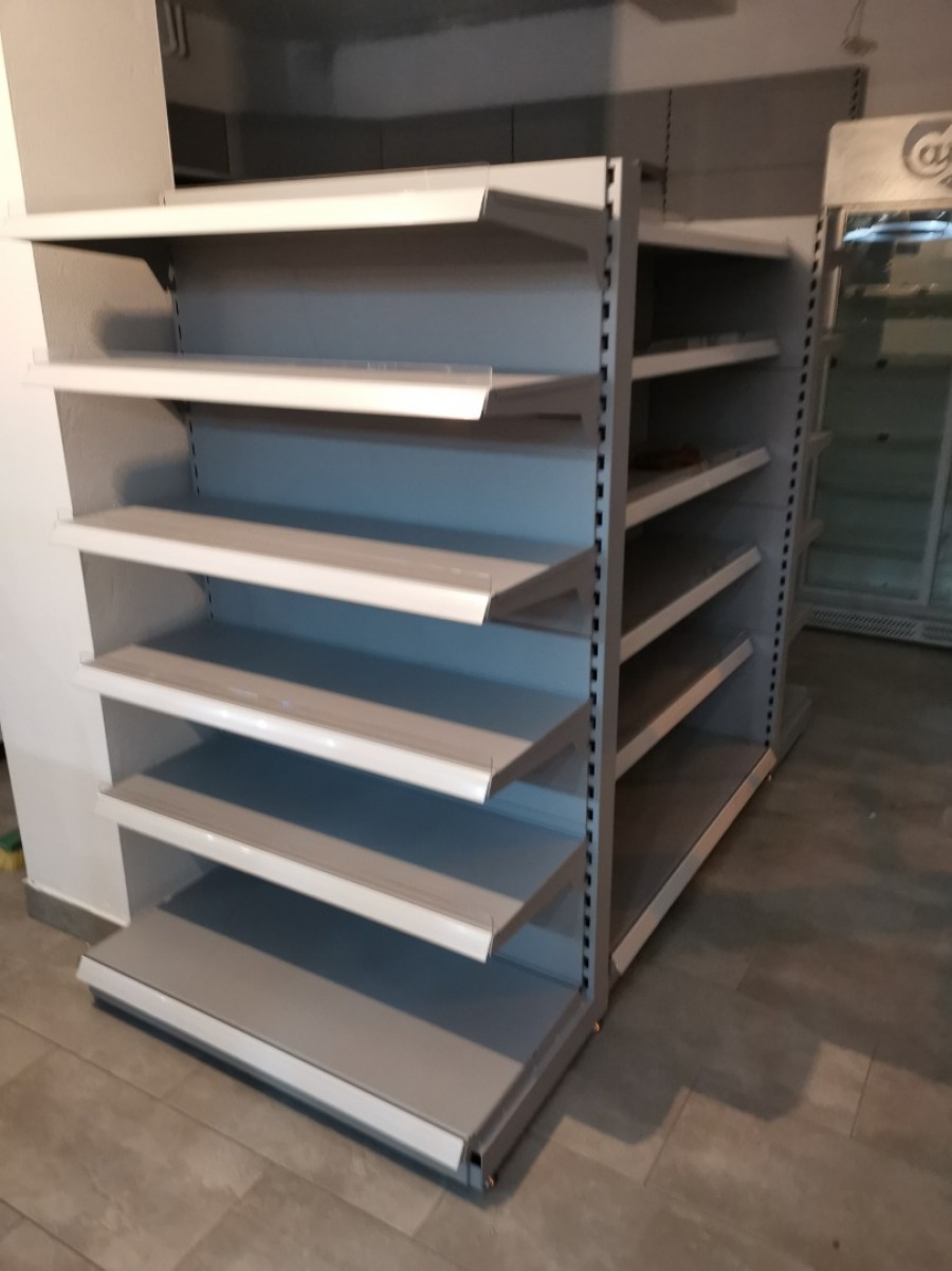Niewielki sklep spożywczy umeblowany regałami metalowymi w kolorze szarym RAL-7040 z elemenetami z płyty w kolorze dąb sonoma. Regał alkoholowy jest wyposażony w lustra na plecach i podświetlenie Led od góry. Ponadto w regał alkoholowy jest wkomponowany regał na papierosy z popychaczami i przegrodami. Obok regału alkoholowego jest regał z pochylonymi półkami na ciastka luzem. Lady sprzedażowe są wykonane z płyty w kolorze dąb sonoma z szarym blatem. Obok lad stoją 2 oszklone gabloty, jedna na pączki i słodkie bułki, a druga na cukierki luzem.