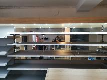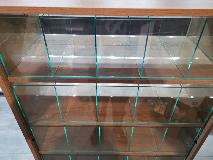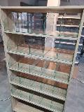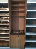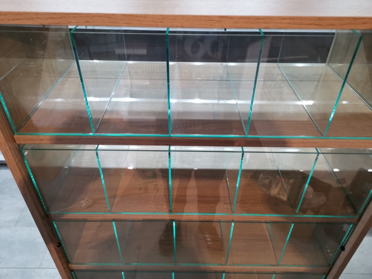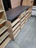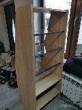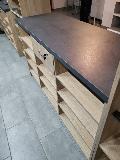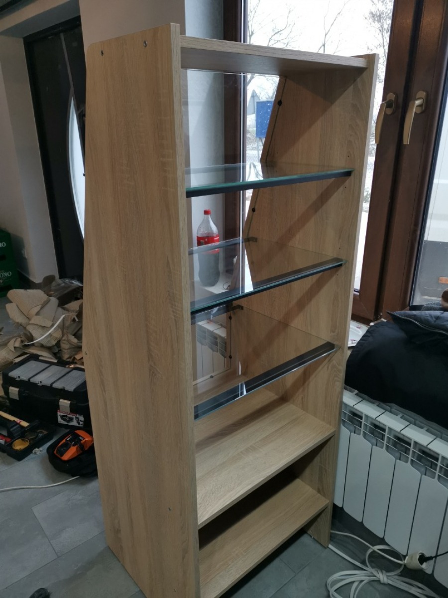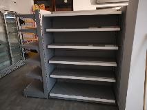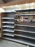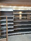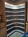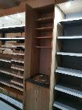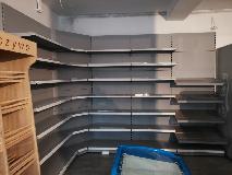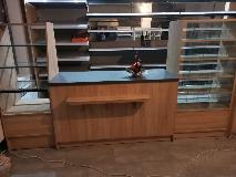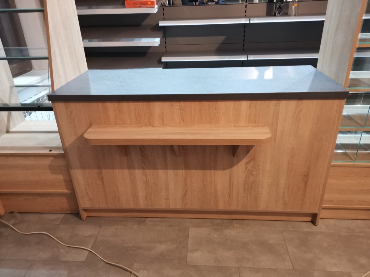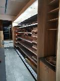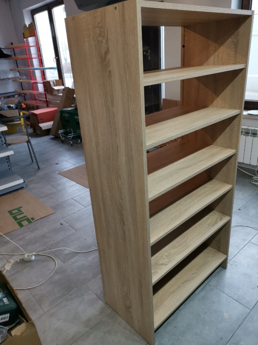 Niewielki sklep spożywczy umeblowany regałami metalowymi w kolorze szarym RAL-7040 z elemenetami z płyty w kolorze dąb sonoma. Regał alkoholowy jest wyposażony w lustra na plecach i podświetlenie Led od góry. Ponadto w regał alkoholowy jest wkomponowany regał na papierosy z popychaczami i przegrodami. Obok regału alkoholowego jest regał z pochylonymi półkami na ciastka luzem. Lady sprzedażowe są wykonane z płyty w kolorze dąb sonoma z szarym blatem. Obok lad stoją 2 oszklone gabloty, jedna na pączki i słodkie bułki, a druga na cukierki luzem.