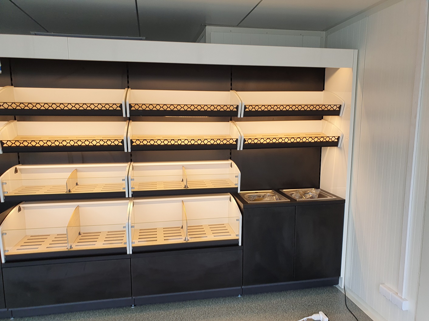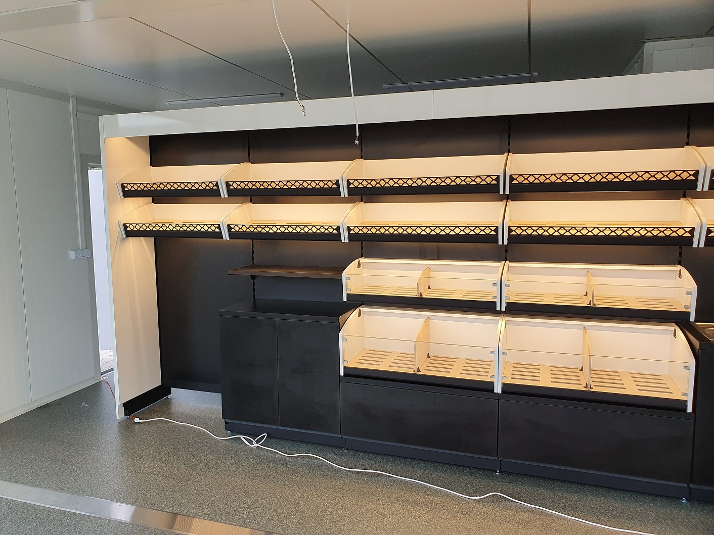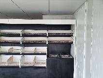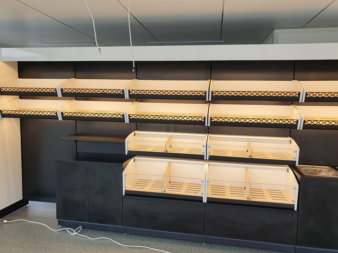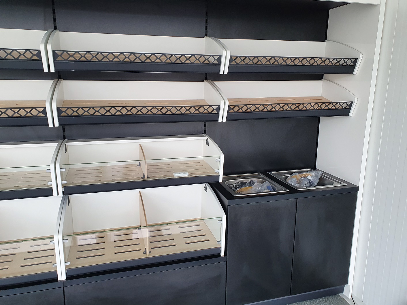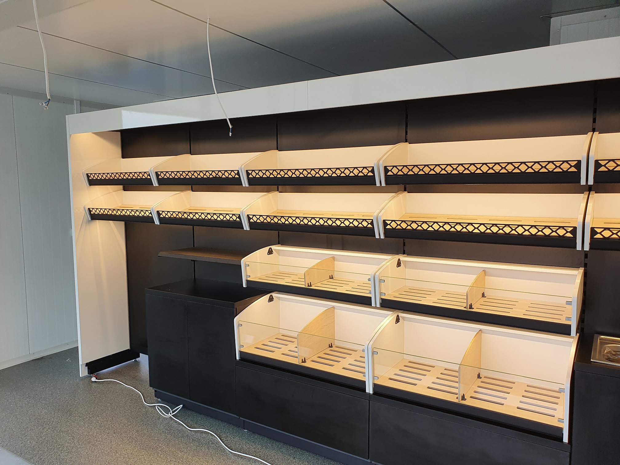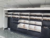Piekarnia cukiernia wykonana przy zastosowaniu regałów chlebowych nowego typu dostępnych w naszej ofercie. Półki regału w kolorze białym podświetlane paskami ledowymi od dołu, górny element oraz boki podwójne wykonane z płyty biały połysk. Od góry podświetlenie regału paskiem ledowym. Szafki plecy regału wykonane z płyty czarnej. Szuflady czarne na prowadnicach bluma.