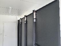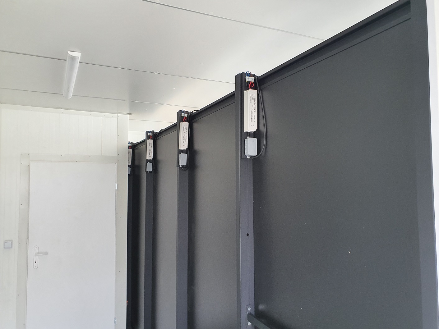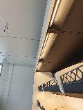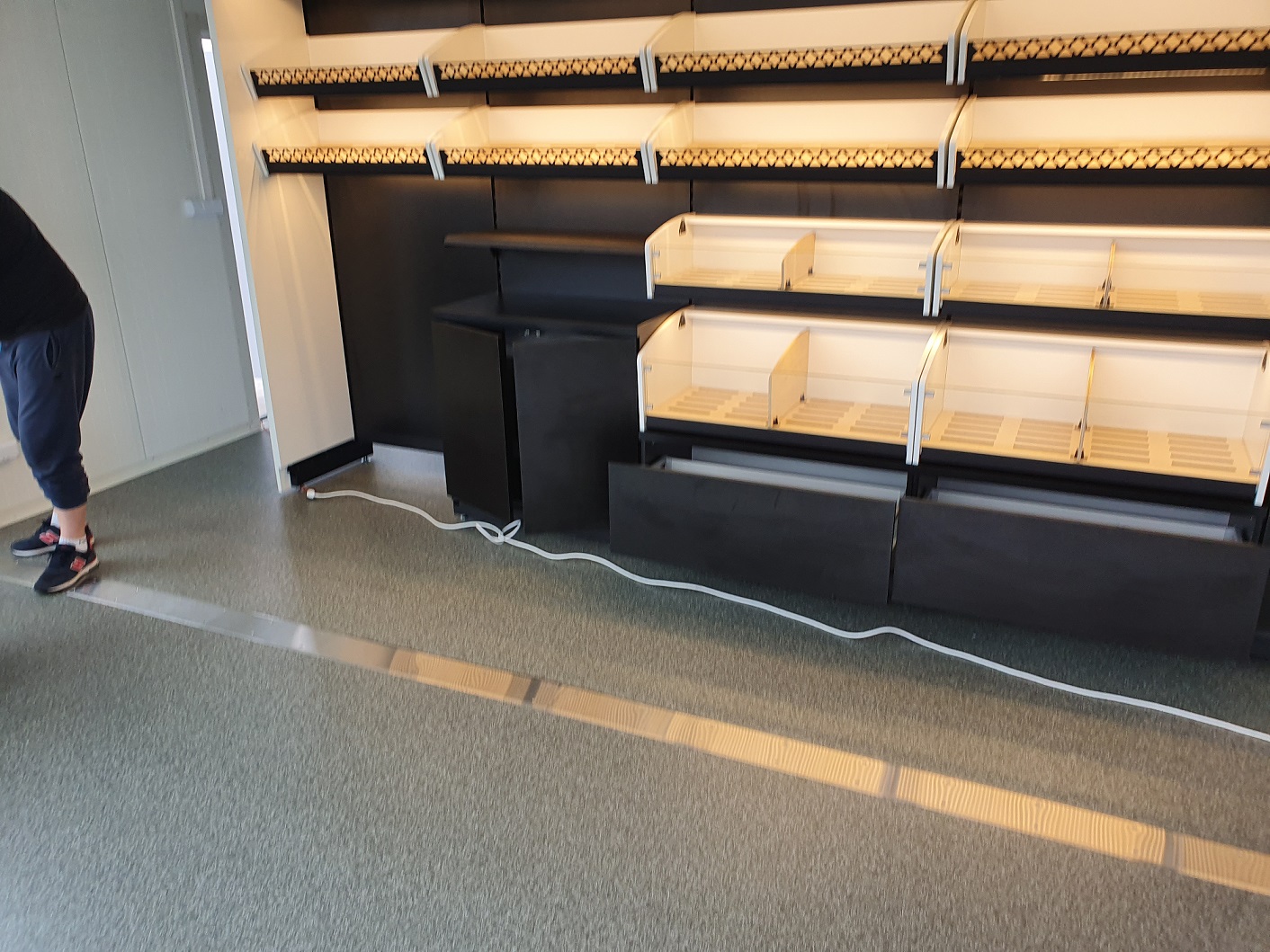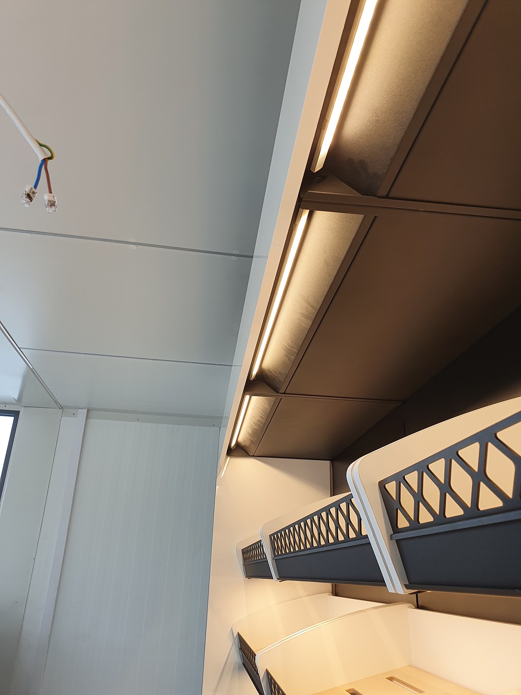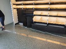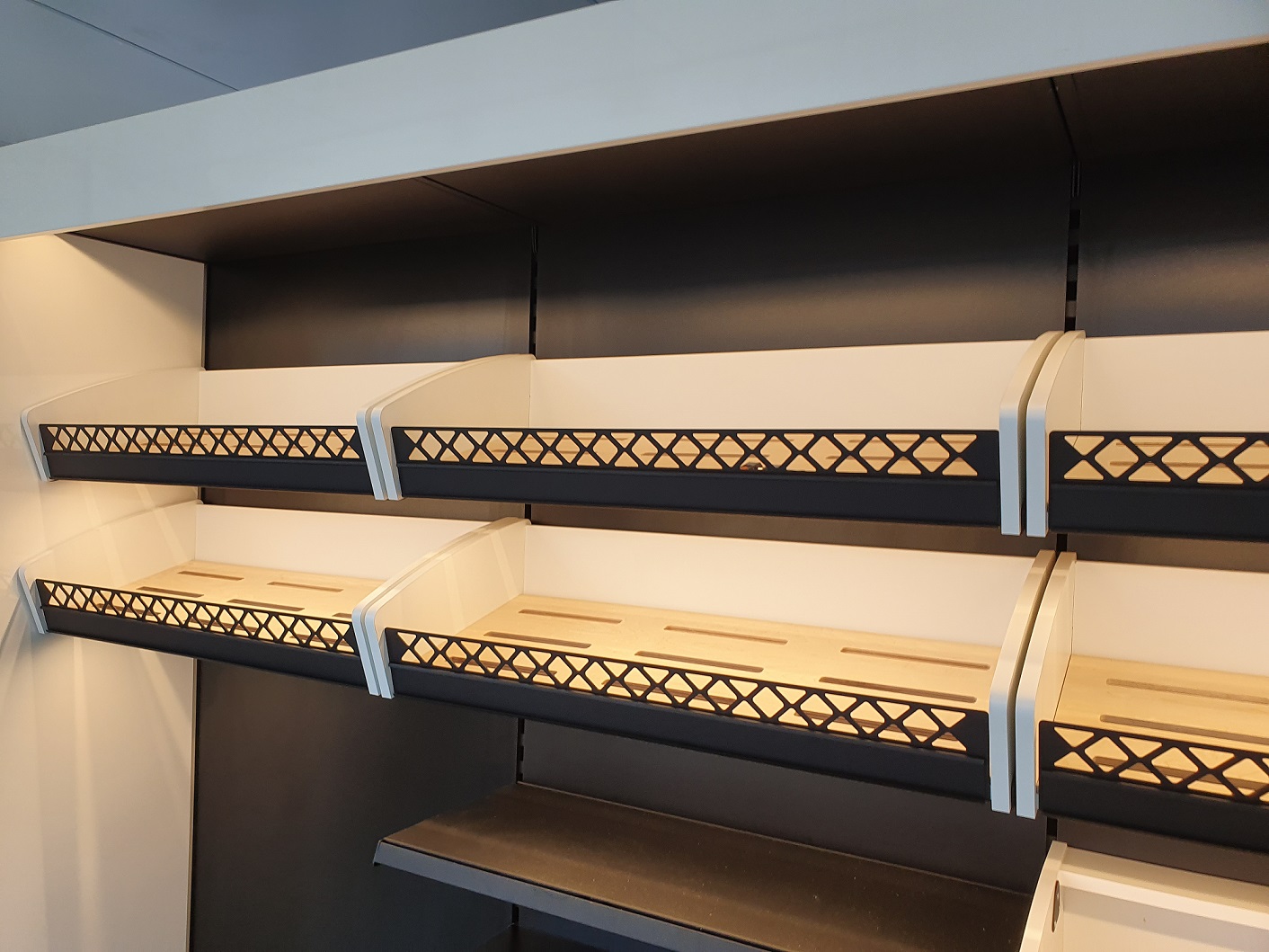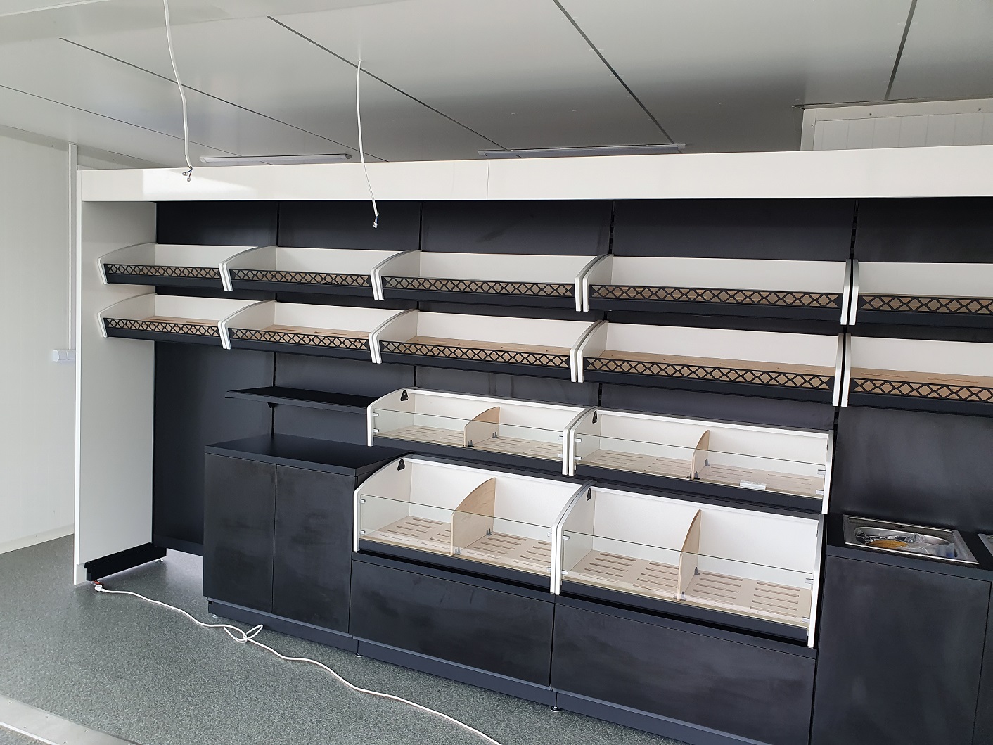 Piekarnia cukiernia wykonana przy zastosowaniu regałów chlebowych nowego typu dostępnych w naszej ofercie. Półki regału w kolorze białym podświetlane paskami ledowymi od dołu, górny element oraz boki podwójne wykonane z płyty biały połysk. Od góry podświetlenie regału paskiem ledowym. Szafki plecy regału wykonane z płyty czarnej. Szuflady czarne na prowadnicach bluma.